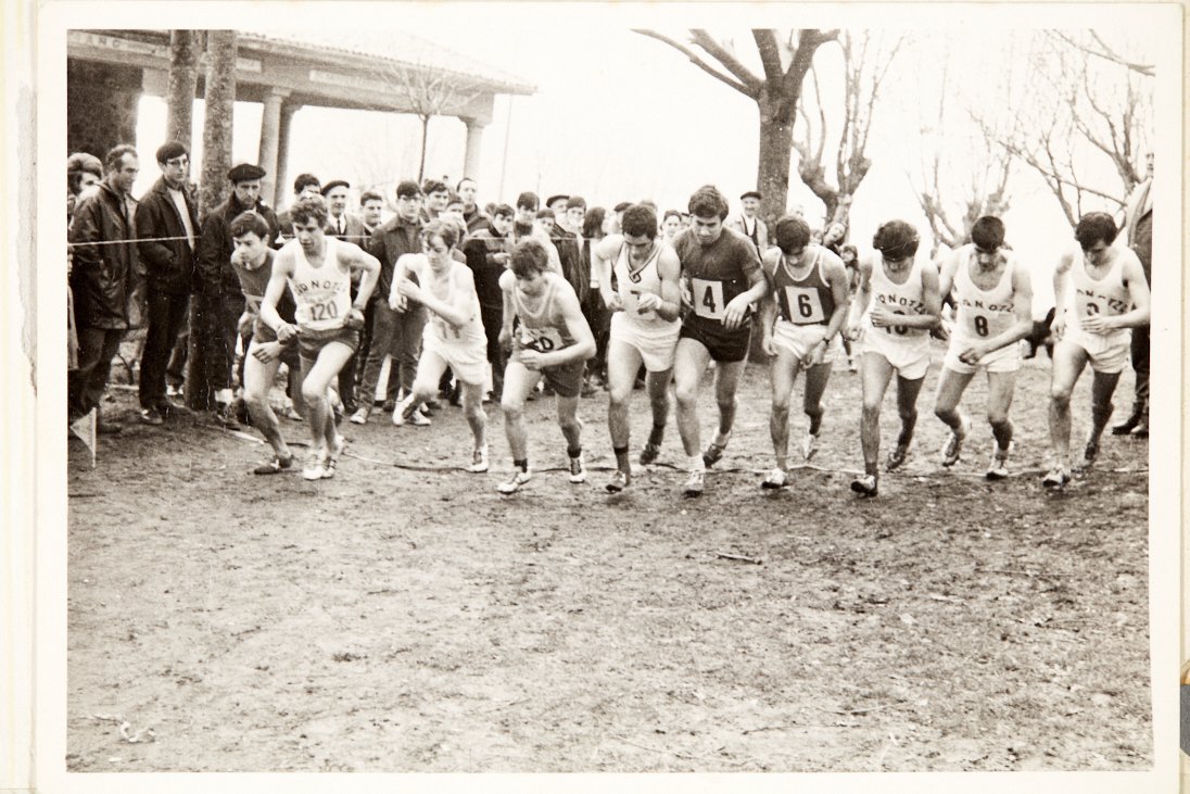 Bertan ageri da atletismo lasterketa baten irteera Arrateko zelaian. Alde batean ikusleak eta eliza daude