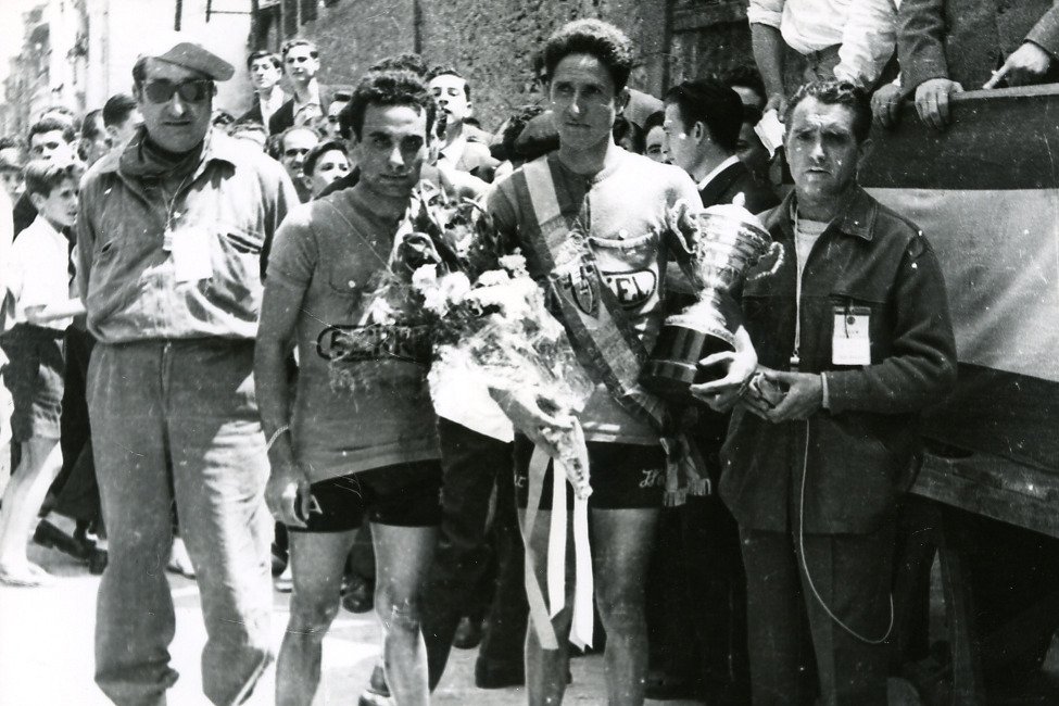 Bertan ageri dira Ansola "El Che", Salvador Baños eta Juanito Txoko Espainiako Mendi Txapèlketan. Erdiko txirrindulariak garaikurra eta loreak ditu eskuan