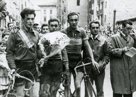 Bertan ageri da Pedro Aguirretxe eskuan loreak dituela IX. Espainiako Ciclo Cros Txapelketan, ondoan beste bi txirrindulari eta Juanito Txoko dituela. Afizionatu mailan garailea izan zen