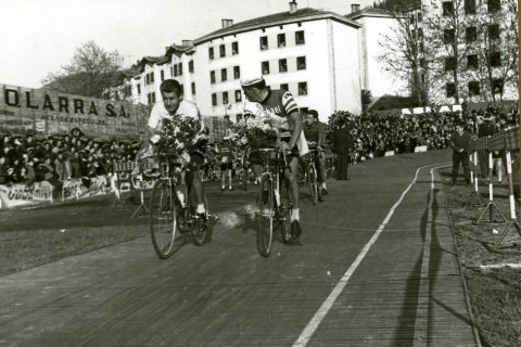 Bertan ageri da Jacques Anquetil beste txirrindulari batzuekin, loreak eskuan dituztela Ipuruako belodromoan ohorezko itzulia ematen Espainiako Itzulian