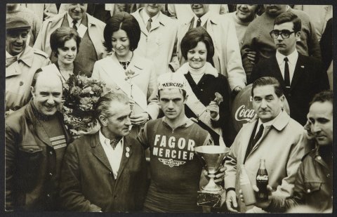 Bertan ageri da Txomin Perurena garaikurra jasotzen, atzean jende ugari duela. Criterium Europeo de MontaƱa irabazi zuen