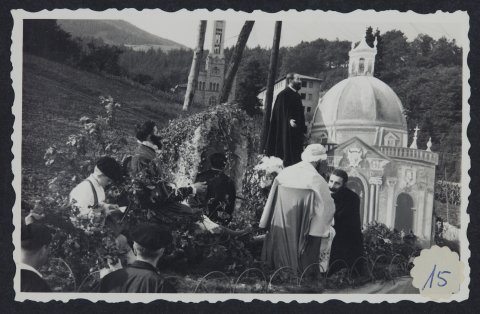 Karroza baten gainean haur eta helduak antzezten daude. Karrozan Loiolako Santutegiaren "erreplika" bat dago.