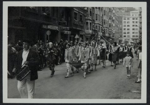 1966 urteko Euskal Jaian gazteak soka-dantza dantzatzera bidean Eibarko kaleetatik. Alboetan ikusleak daude.