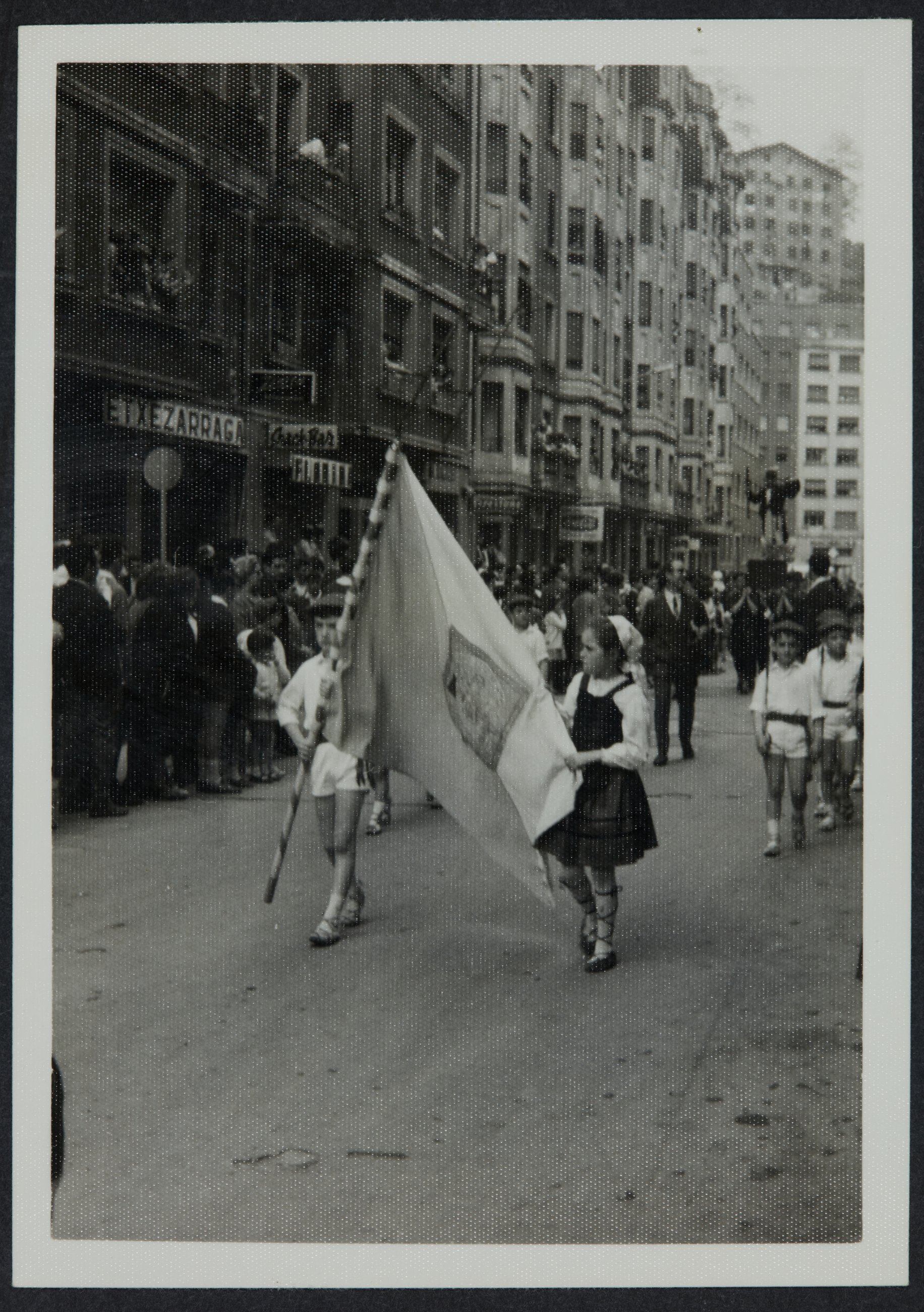 1966 urteko Euskal Jaian dantzari gazteak desfilatzen ari direla argazkia. Aurrean bi haur daude bandera bat eramaten.