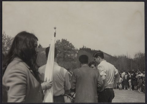 Plaza batean dantzari eta dultzaineroak daude. Atzean ikusleak daude.