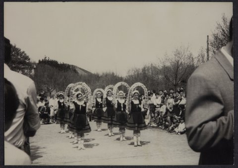 Uztai-dantza dantzatzen ari den neska talde bat agertzen da plaza batean. Inguruan ikusleak daude.
