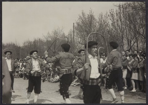 Uztai-dantza dantzatzen ari den gizon talde bat agertzen da plaza batean. Inguruan ikusleak daude.