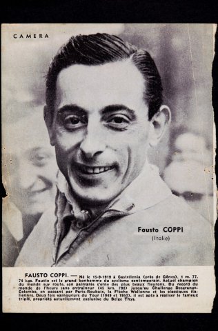 Bertan ageri da Fausto Coppi txirrindulariaren argazkia. Azpian frantsesez idatzitako testu bat du