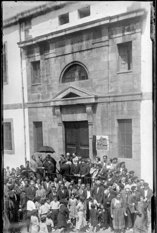 Jende ugari ikus daiteke "Escuela Pública de Instrucción Primaria" idatzita duen eraikuntzaren parean.