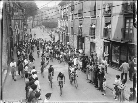 Argazkian hainbat txirrindulari daude lasterketa batean, eta errepidearen bi aldeak ikuslez beteta daude. Eraikuntzen itxuraren arabera San Juan kalean daudela dirudi, eta atzean Untzaga plaza dagoela.