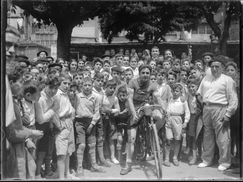 Argazkian txirrindulari bat dago, eta bere atzean ume asko ikus daitezke.